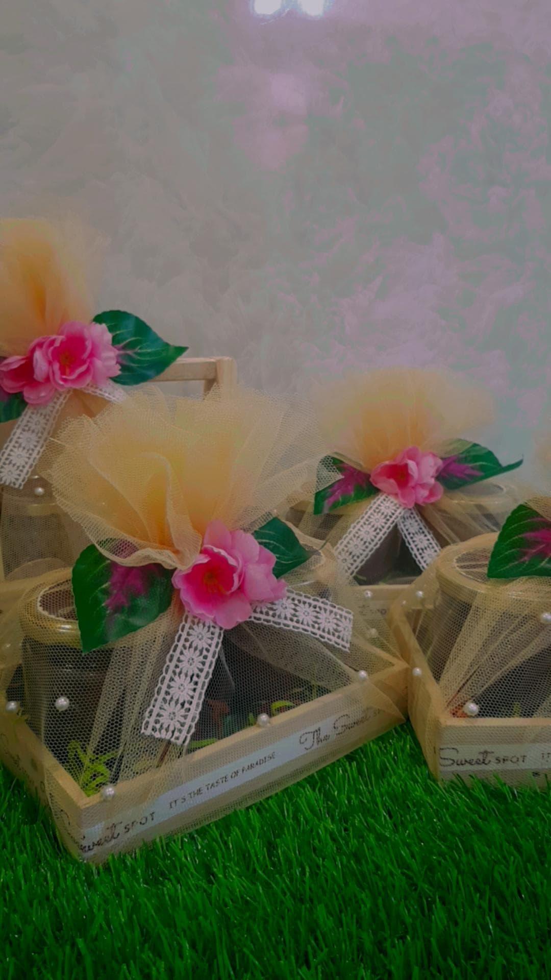 Elegant and charming, this set of decorated jars is the perfect sweet gesture for any occasion. The wooden crate packaging and lace-net detailing make it an ideal return gift or festive hamper. Customization available for bulk orders.